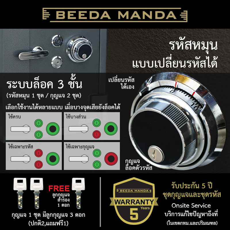 - ระบบล็อค 3 ชั้น (รหัสหมุน 1 ชุด / กุญแจ 2 ชุด)