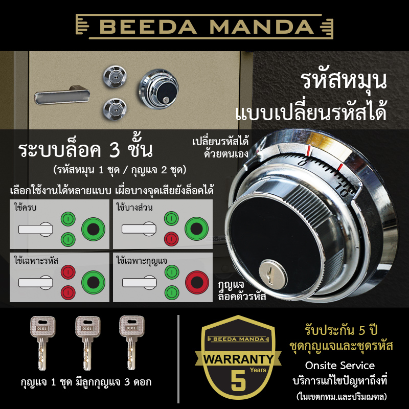- ระบบล็อค : ล็อค 3 ชั้น (รหัสหมุน 1 ชุด / กุญแจ 2 ชุด)