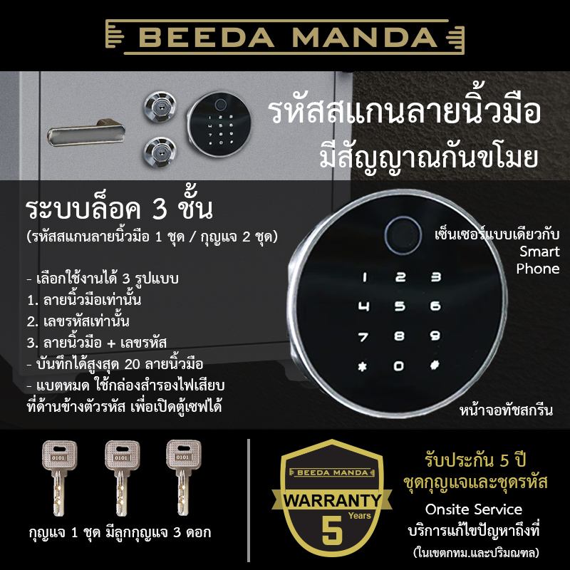 - ระบบล็อค : ล็อค 3 ชั้น (รหัสสแกนลายนิ้วมือ 1 ชุด / กุญแจ 2 ชุด)